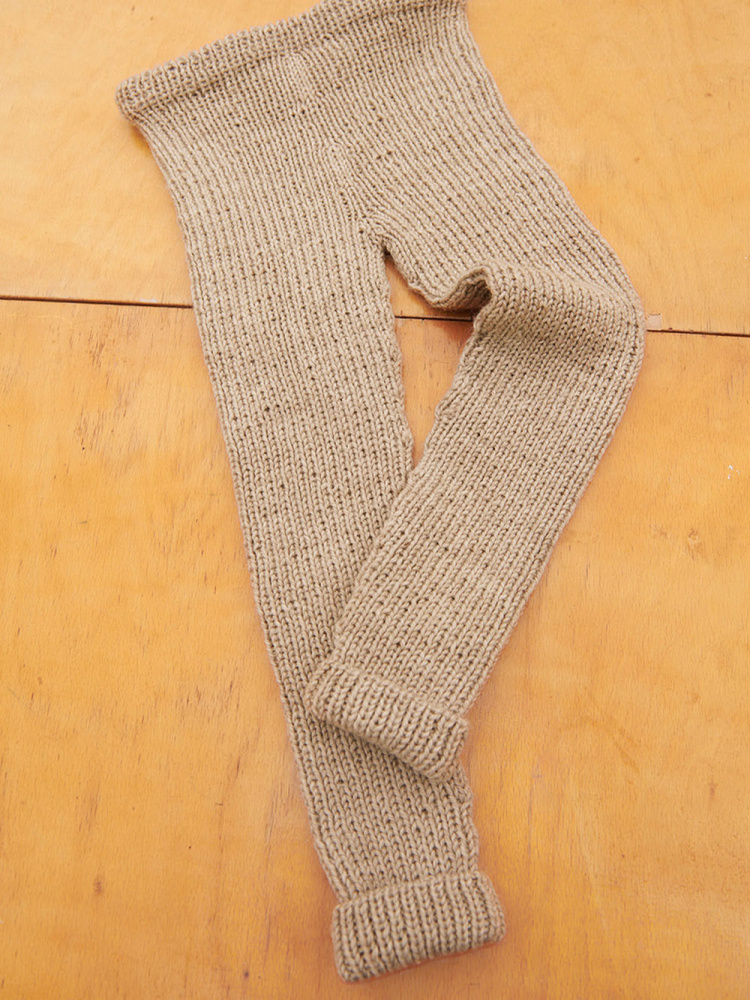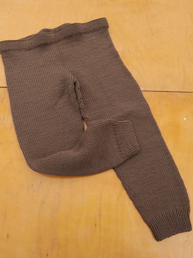 Buksen strikkes ovenfra og ned i glattstrikk.