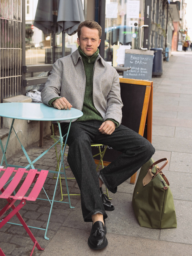 Halskanten strikkes til slutt i vrangbord frem og tilbake. Det strikkes vendepinner på venstre og høyre side av halskanten, slik at den er høyere foran enn bak. Den brettes ned mot vrangsiden og det strikkes frem og tilbake med fellinger over forkanten for å følge den dypere halsutringningen. Det strikkes opp masker langs sidene på forstykkene hvor glidelåsen skal monteres. Glidelås sys fast til slutt.