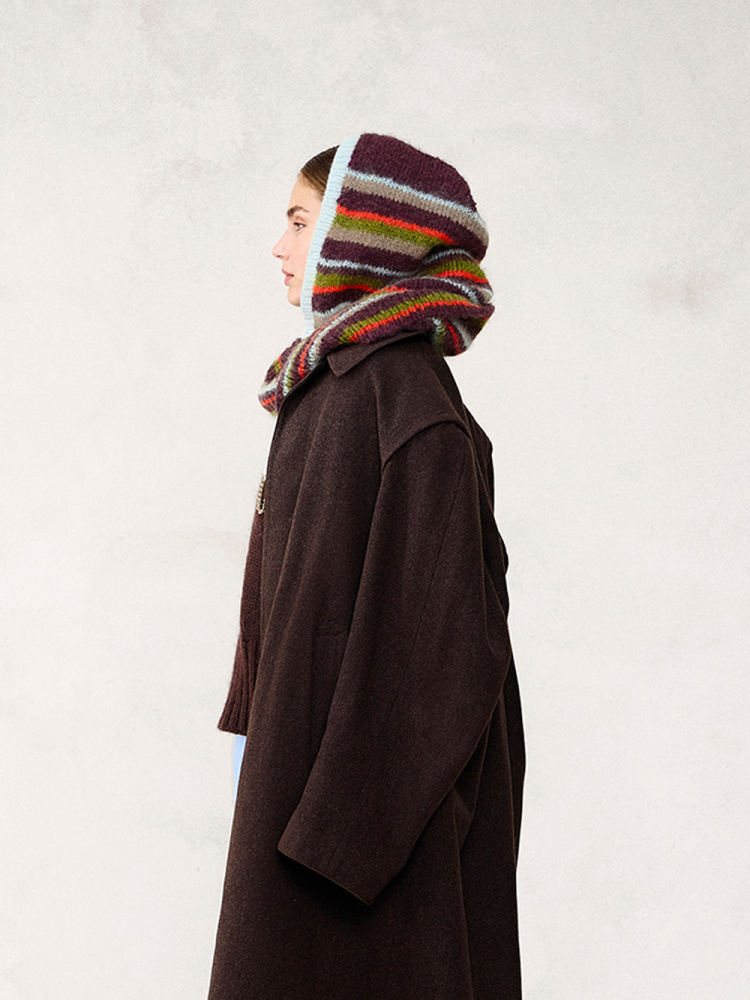 Snuggle Hood i Børstet Alpakka med striper i Ballerina Chunky Mohair eller ensfarget i Børstet Alpakka – en myk og varm hette med hals som kan surres rundt 2–3 ganger. Strikkes ovenfra og ned i glattstrikk, perfekt for å holde deg lun og stilig på kjølige dager.