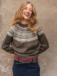 Denne Marius-genseren i Tynn Peer Gynt har en myk A-fasong som gir et moderne uttrykk til det klassiske mønsteret. Strikkes ovenfra og ned.