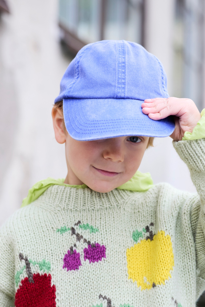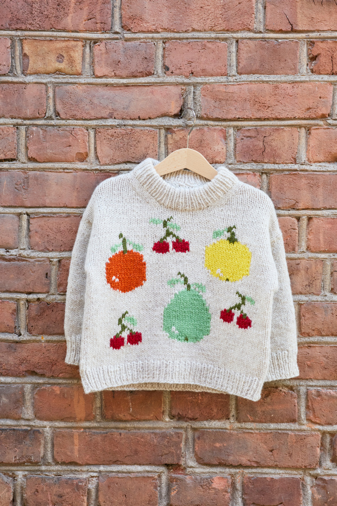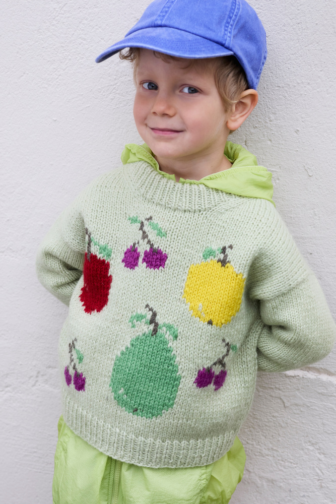 Fruktfestgenseren er en herlig og leken genser, strikket i glattstrikk med søte fruktmotiver i intarsiateknikk. Den strikkes ovenfra og ned, med «European shoulders» (skrå skuldre). Genseren har en ledig passform, rund hals og kanter i 1x1 ribb. For- og bakstykket strikkes hver for seg og sys sammen i sidene.