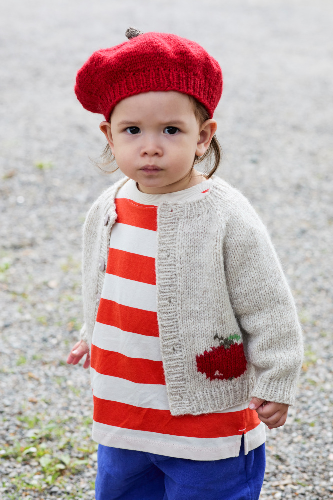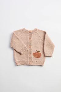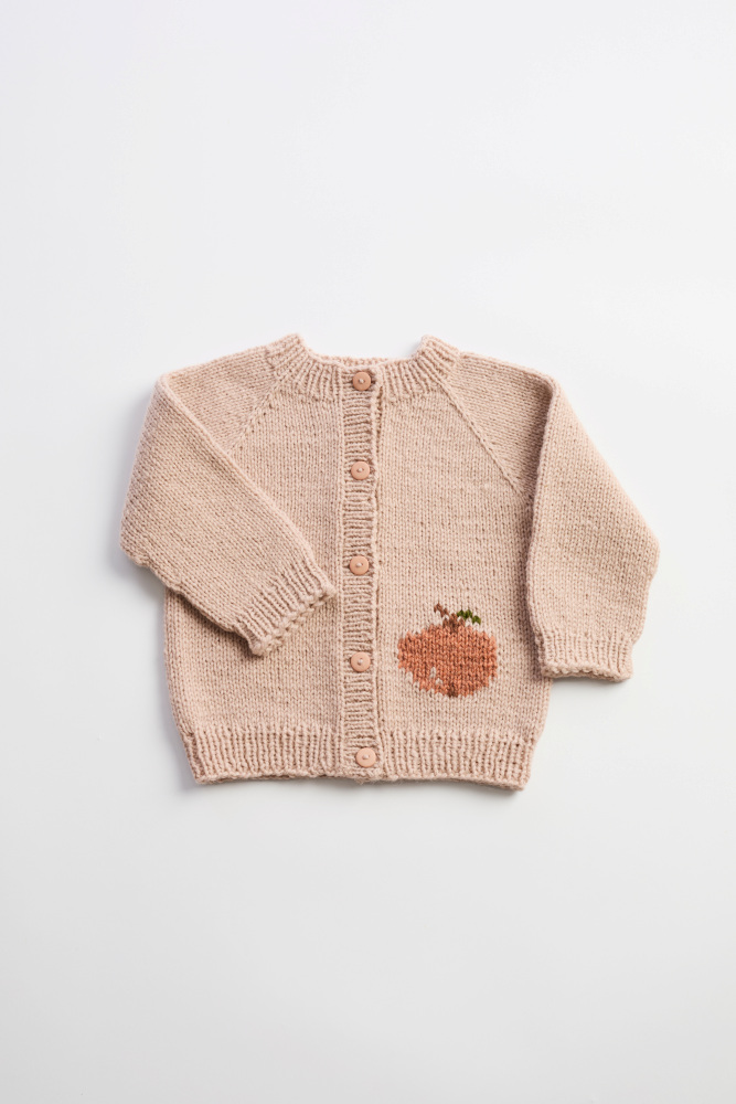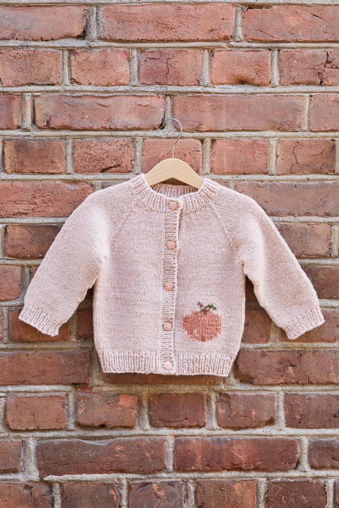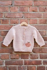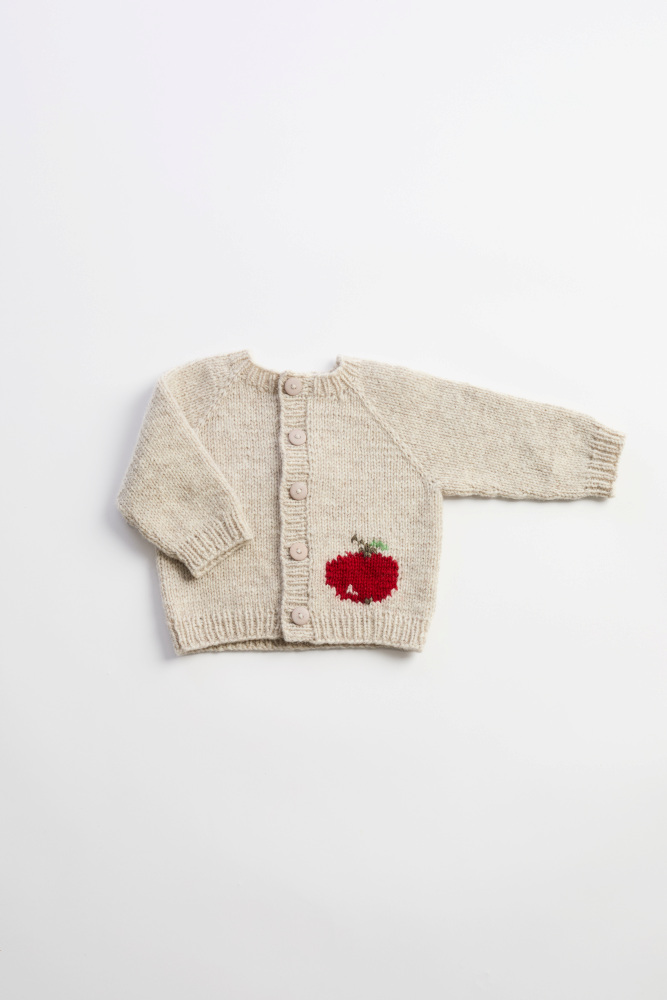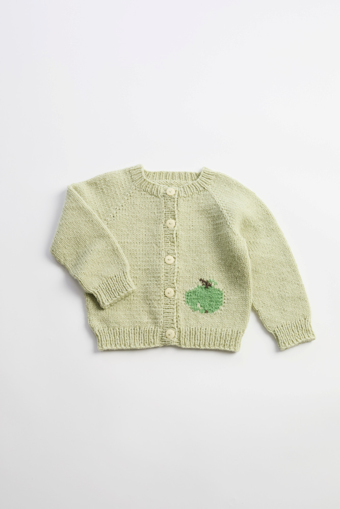Fruktig jakke er en enkel glattstrikket jakke, med kanter i 1x1 ribb og et søtt eplemotiv strikket i intarsiateknikk. Jakken har en klassisk passform og strikkes frem og tilbake, ovenfra og ned. Arbeidet starter i halsen. Halsutringningen formes ved å strikke vendepinner, samtidig som det økes til raglan på hver side av raglan-maskene. Når raglanøkningene er ferdige, strikkes bolen og ermer hver for seg, og avsluttes med ribb. Til slutt strikkes det opp masker til knappestolpene som strikkes i 1x1 ribb. Det strikkes knapphull på den ene stolpen og sys knapper på den andre