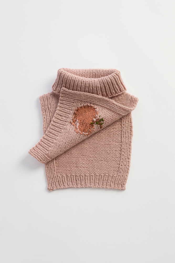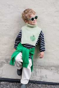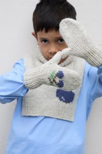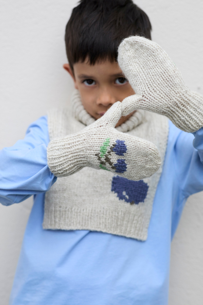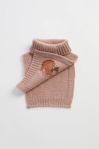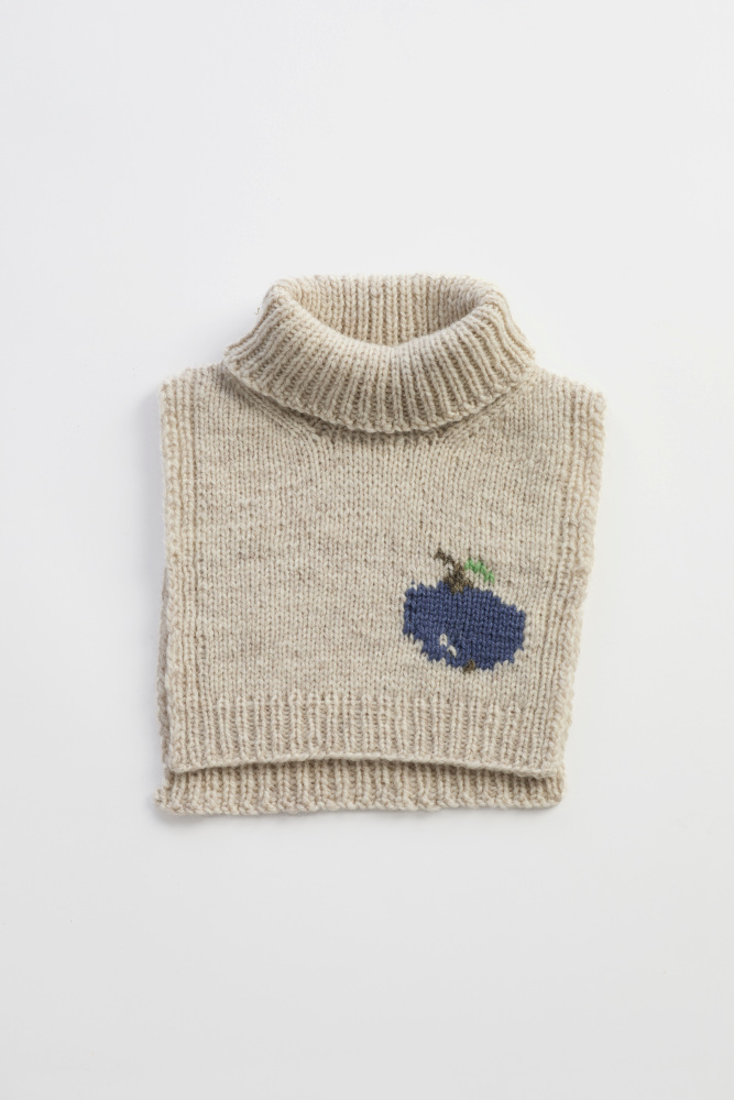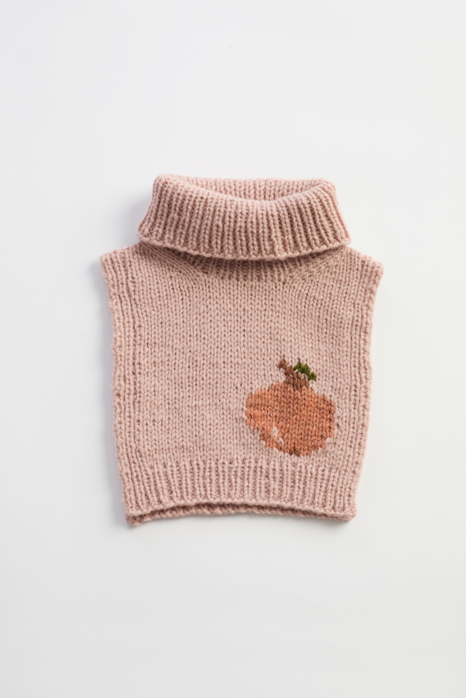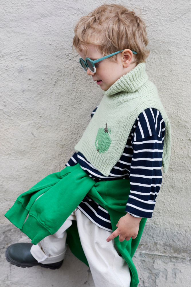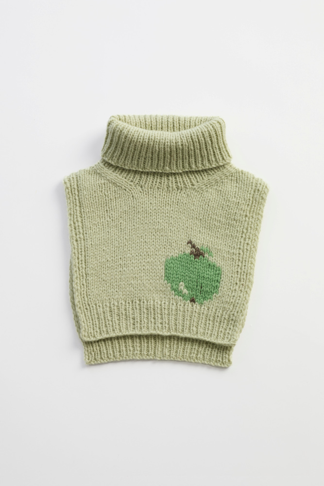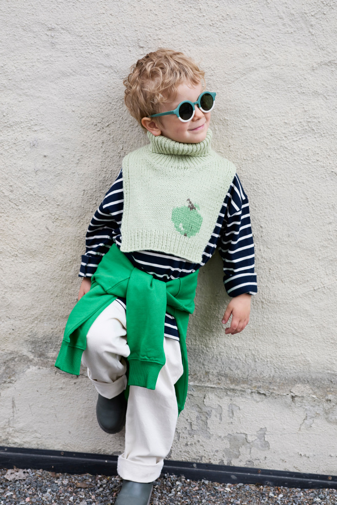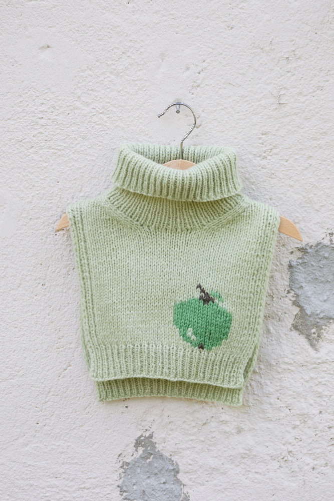 Frukthalsen er en morsom og søt hals som varmer de små. Den er glattstrikket med kanter i 1x1 ribb, med et søtt eplemotiv som strikkes i intarsiateknikk. Den strikkes ovenfra og ned. Først strikkes bakstykket frem og tilbake, og det økes til skrå skuldre.