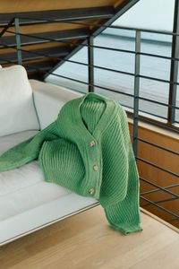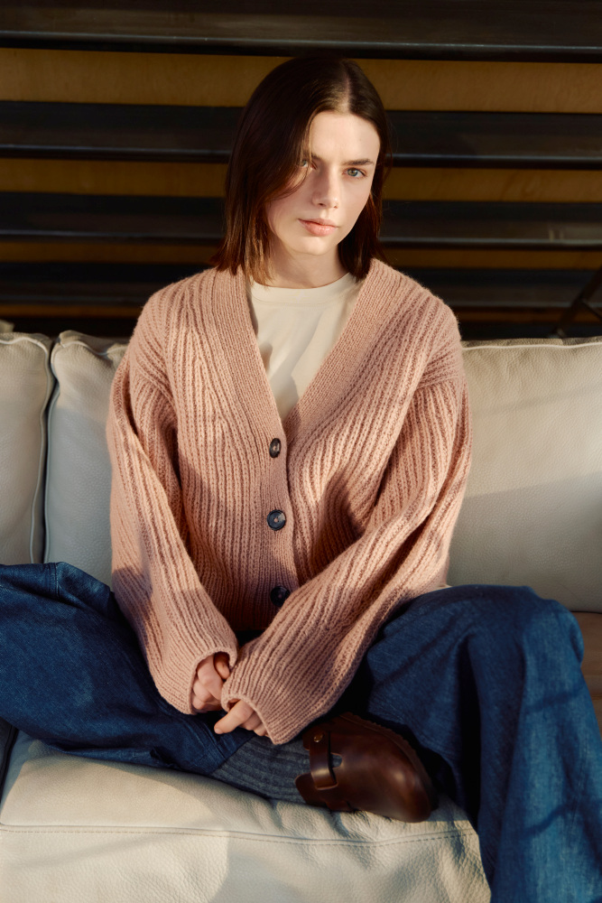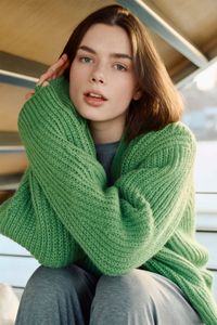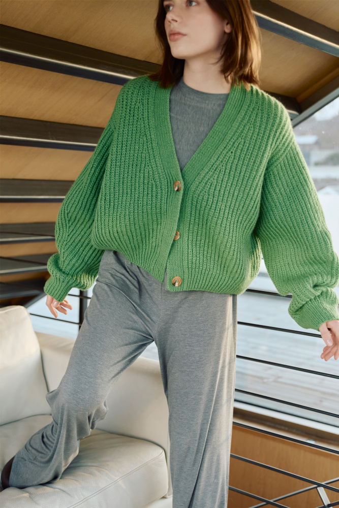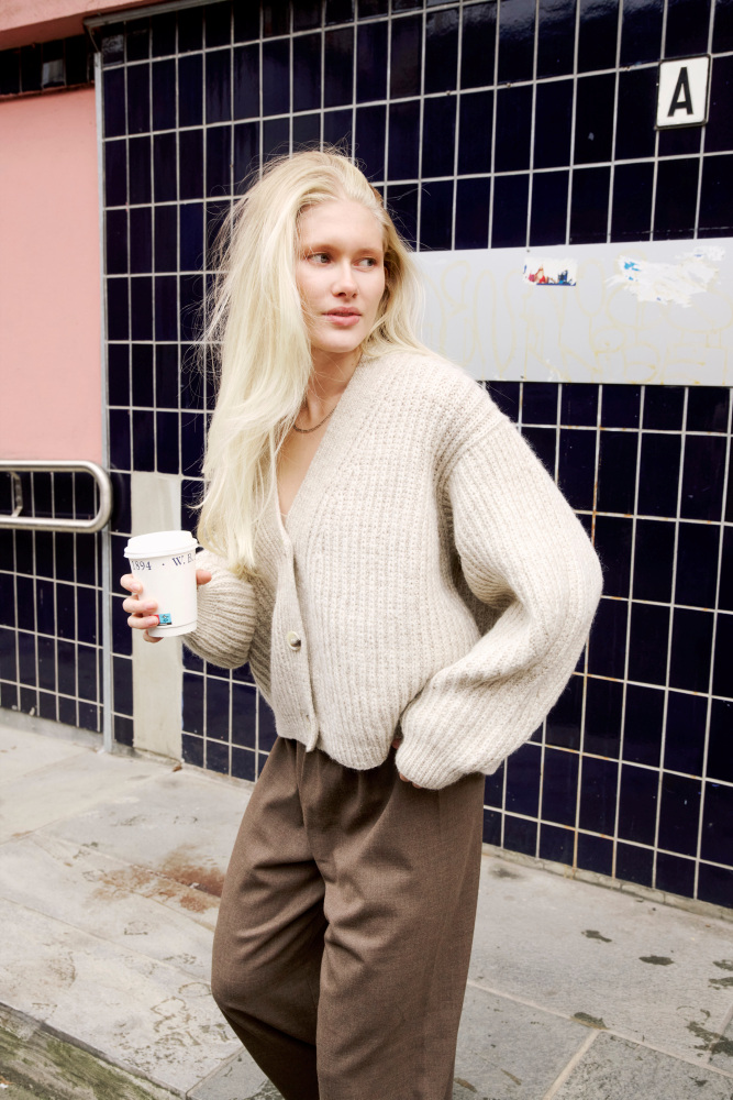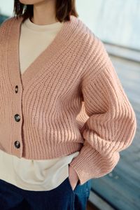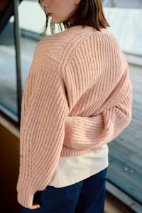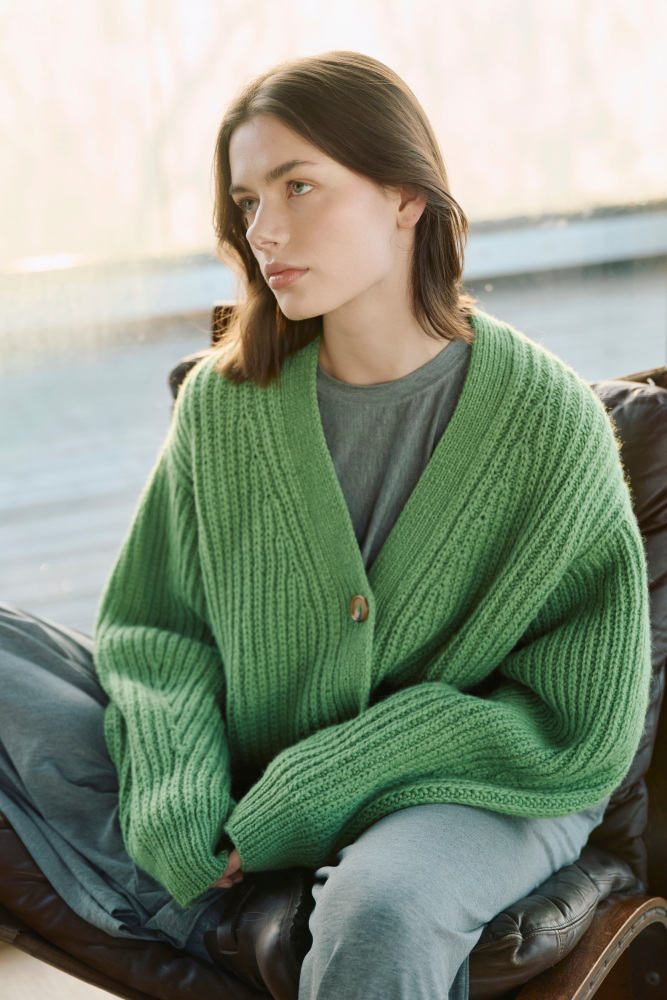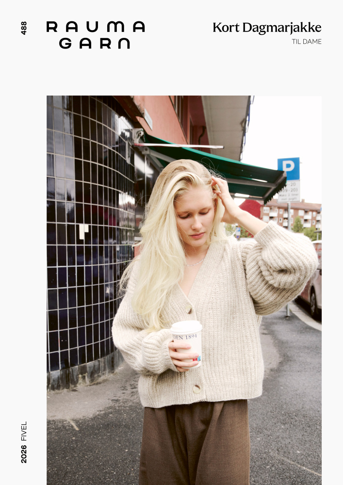 Kort Dagmarjakke er en moderne og stilren jakke i halvpatent, som strikkes ovenfra og ned i myk, norsk lamull. Jakken har european shoulder-konstruksjon og dyp v-hals. Ermene formes ved å felle på yttersiden, noe som gir synlige og dekorative linjer i plagget. Halvpatent gir dybde, tekstur og et luksuriøst uttrykk, og den myke lamulla gir følelsen av å bli omfavnet av et mykt og lunt pledd. Kort Dagmarjakke er en kort versjon av den lange Dagmarjakken, og i tillegg har stilige “utenpå”-lommer.