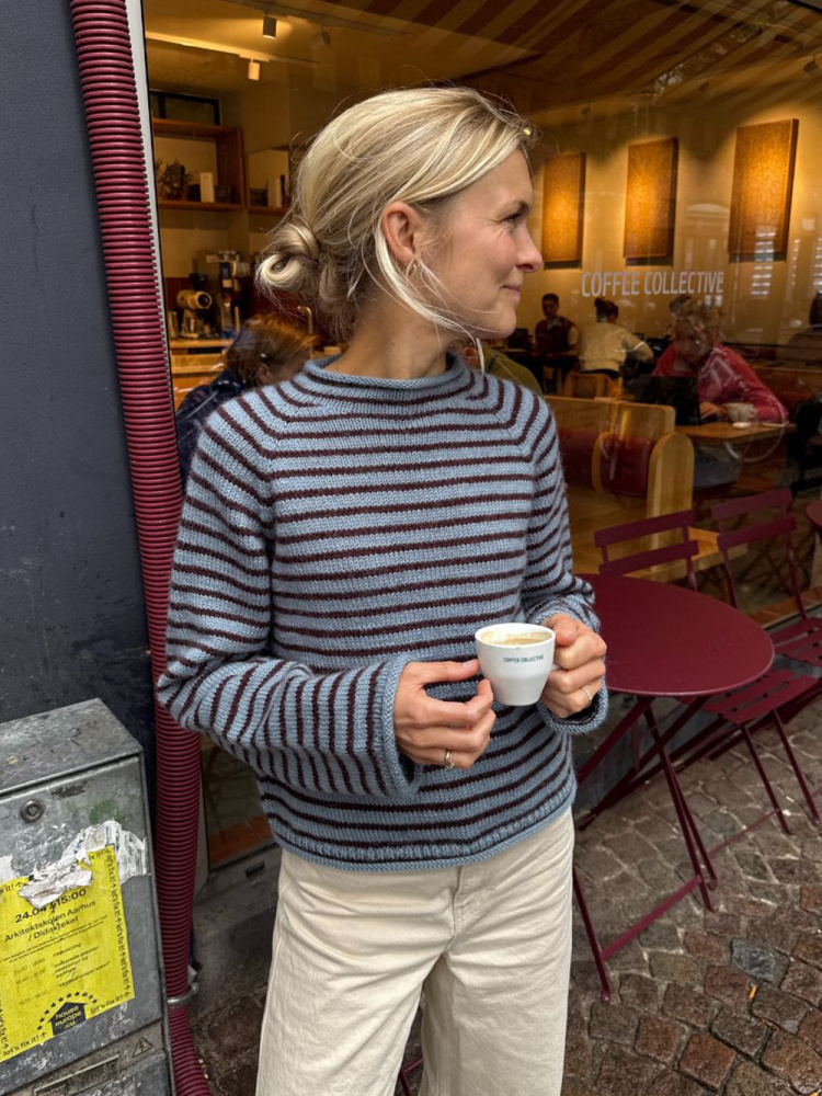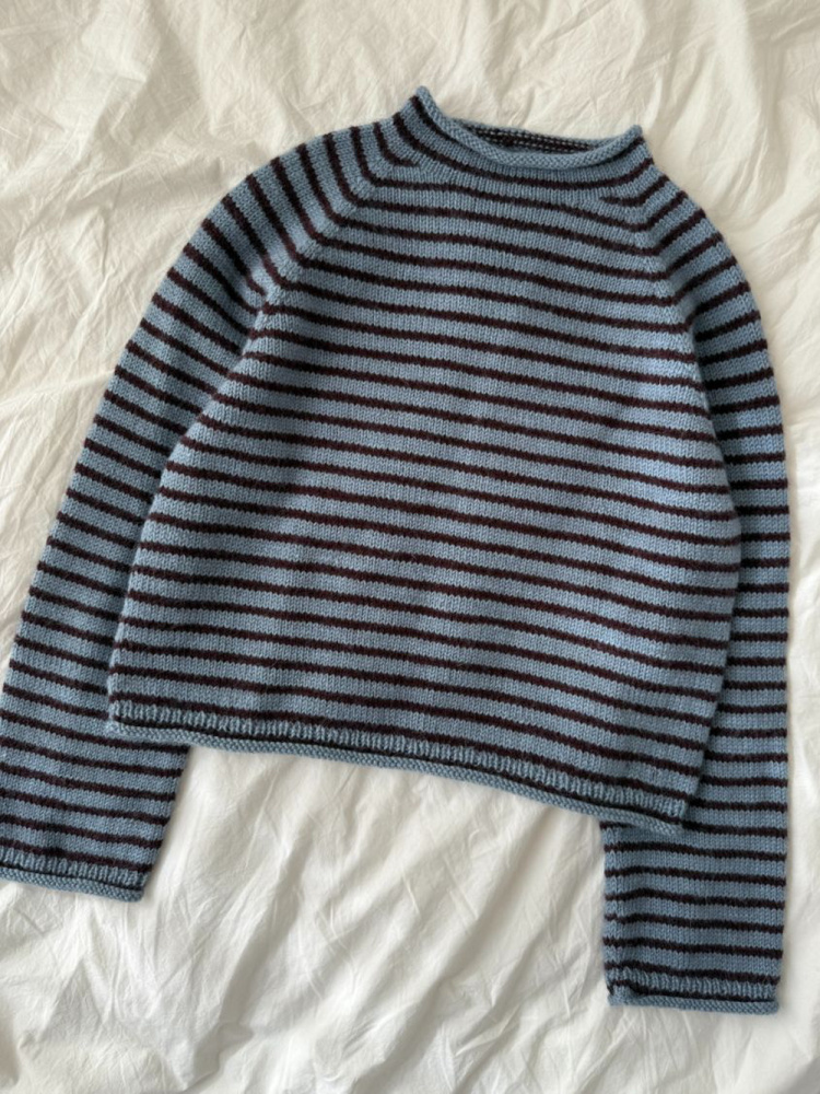 Frankie Sweater strikkes ovenfra og ned med raglanøkninger på bærestykket. Det strikkes vendepinner i nakken for å lage halsutskjæring. Ermene strikkes rundt på strømpepinner eller rundpinne. Frankie Sweater strikkes med smale striper.