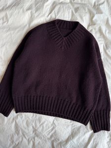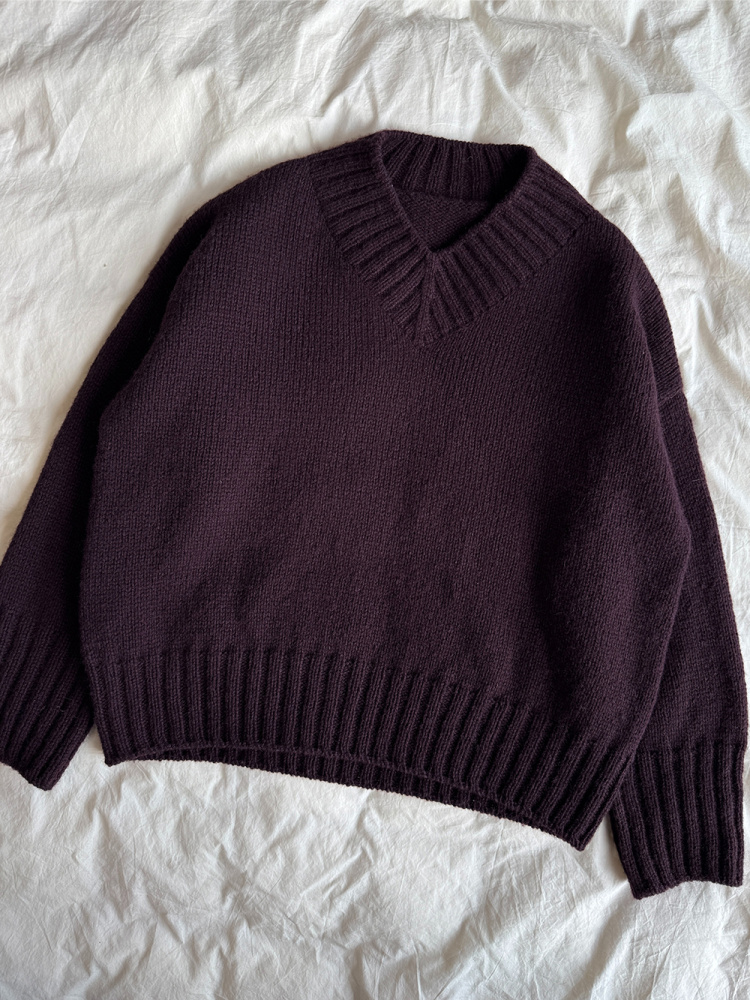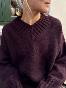 Hannah Sweater V-neck strikkes ovenfra og ned. Bakstykket strikkes først frem og tilbake på pinnen med økninger. Skuldrene og forstykket strikkes, ut fra opplukkede masker på bakstykket, med økninger til en V-utskjæring. Ermene strikkes ut fra opplukkede masker i ermeåpningen. Til slutt plukkes masker opp langs halsåpningen, og det strikkes en halskant i dobbel vrangbord med fellinger foran.